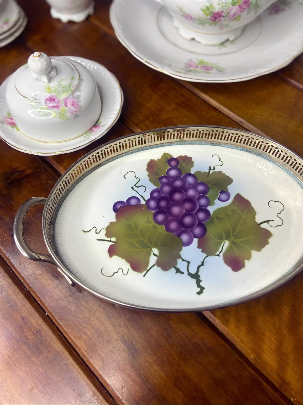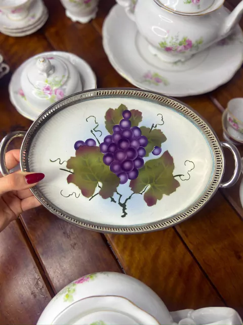 Antiga e rara bandeja majólica alemã, armação em metal prateado. linda e tradicional decoração com frutas,período art deco.