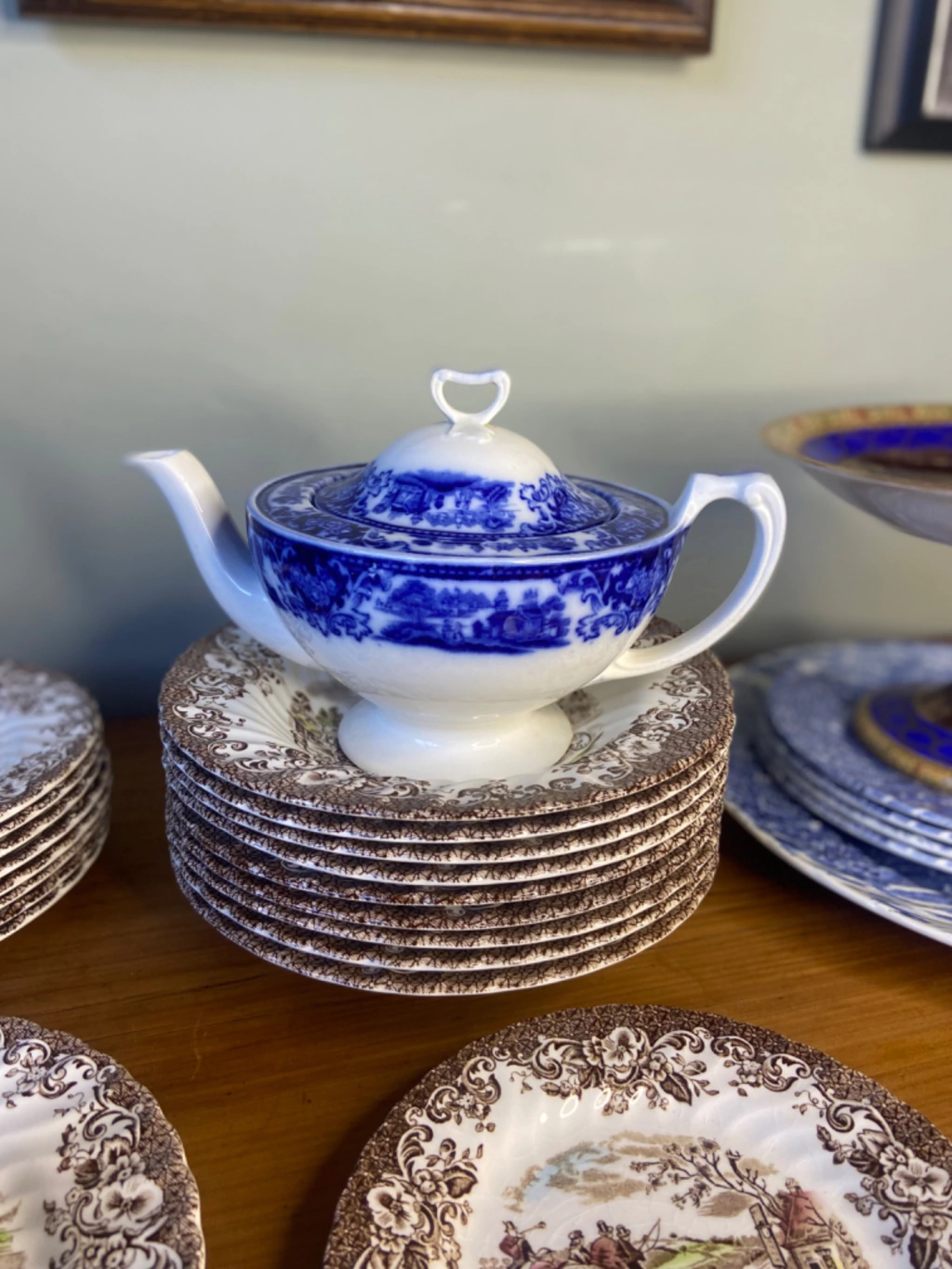Bule de chá em faiança inglesa GRINDLEY" em Borrão, decorados com acantos, flores e paisagens.
