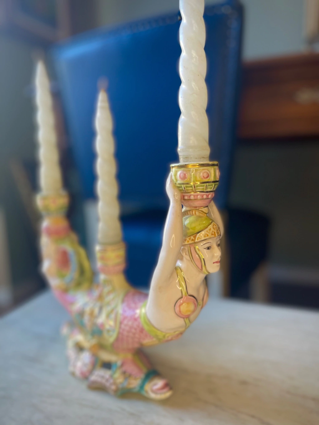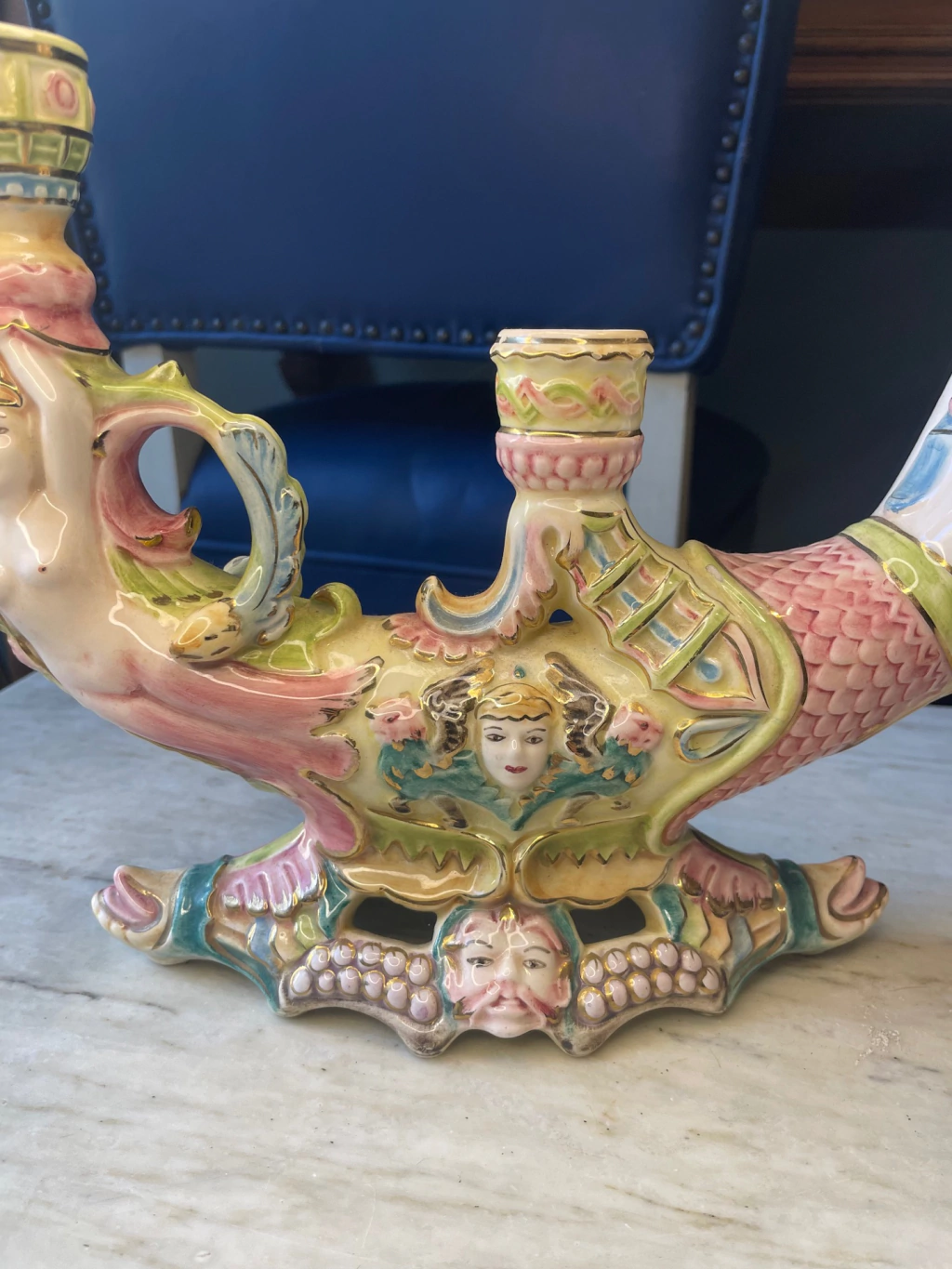 Grandioso e exuberante candelabro em faiança portuguesa, manufaturado em sua base.