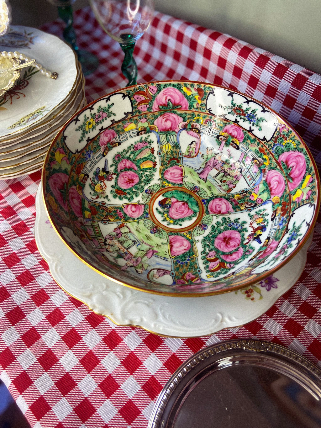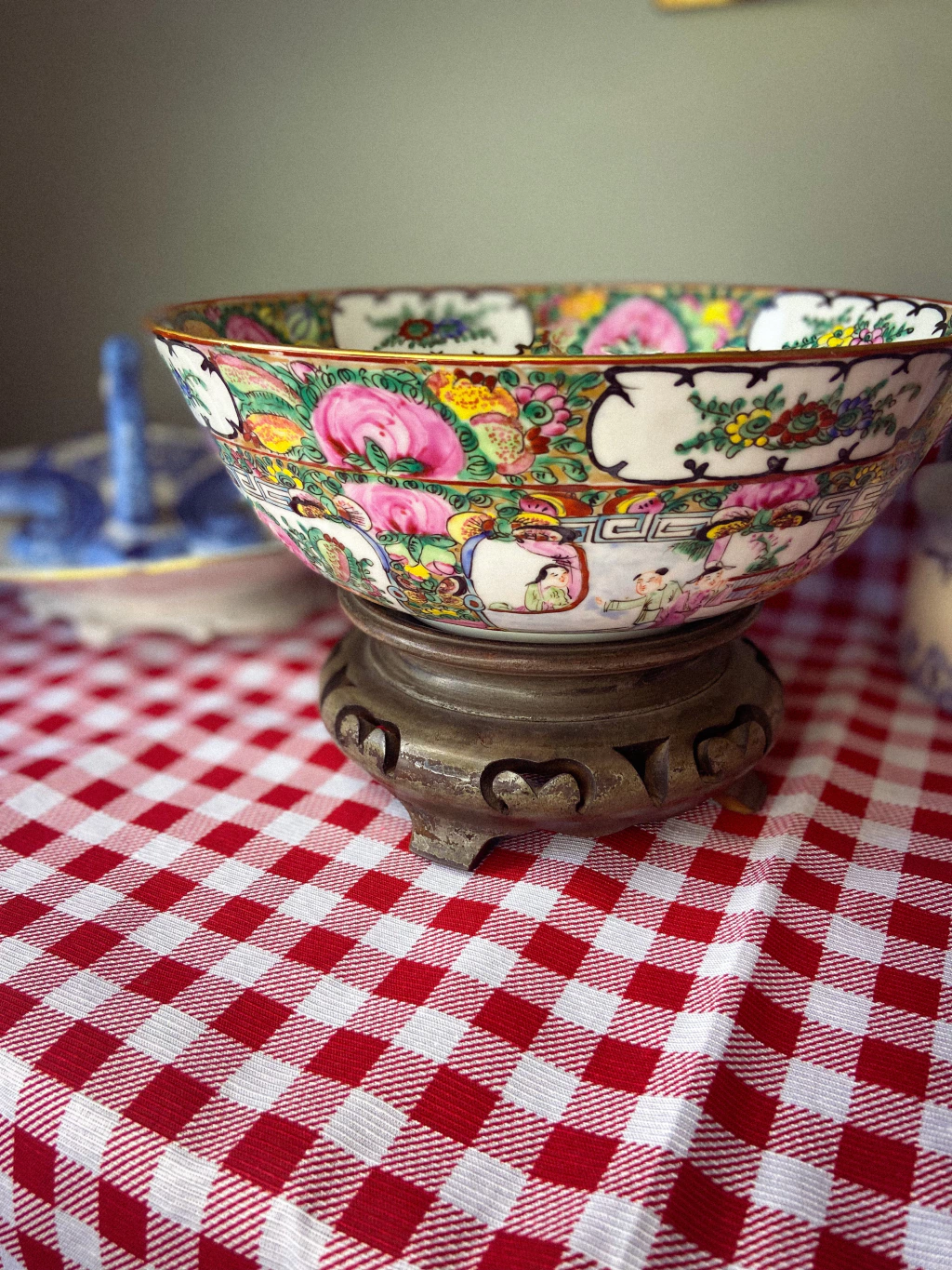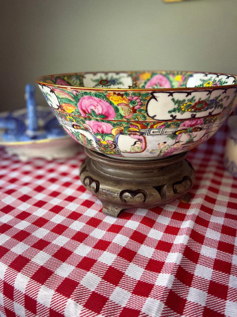 Grandioso centro de mesa em porcelana chinesa,coleção Rose Medalion.Peça raríssima,pois acompanha a base em madeira