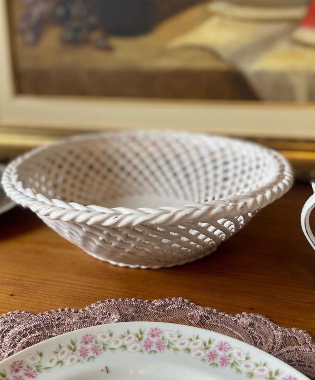 Antiga cesta em porcelana,provavelmente de origem europeia,medindo 24 cm de diâmetro