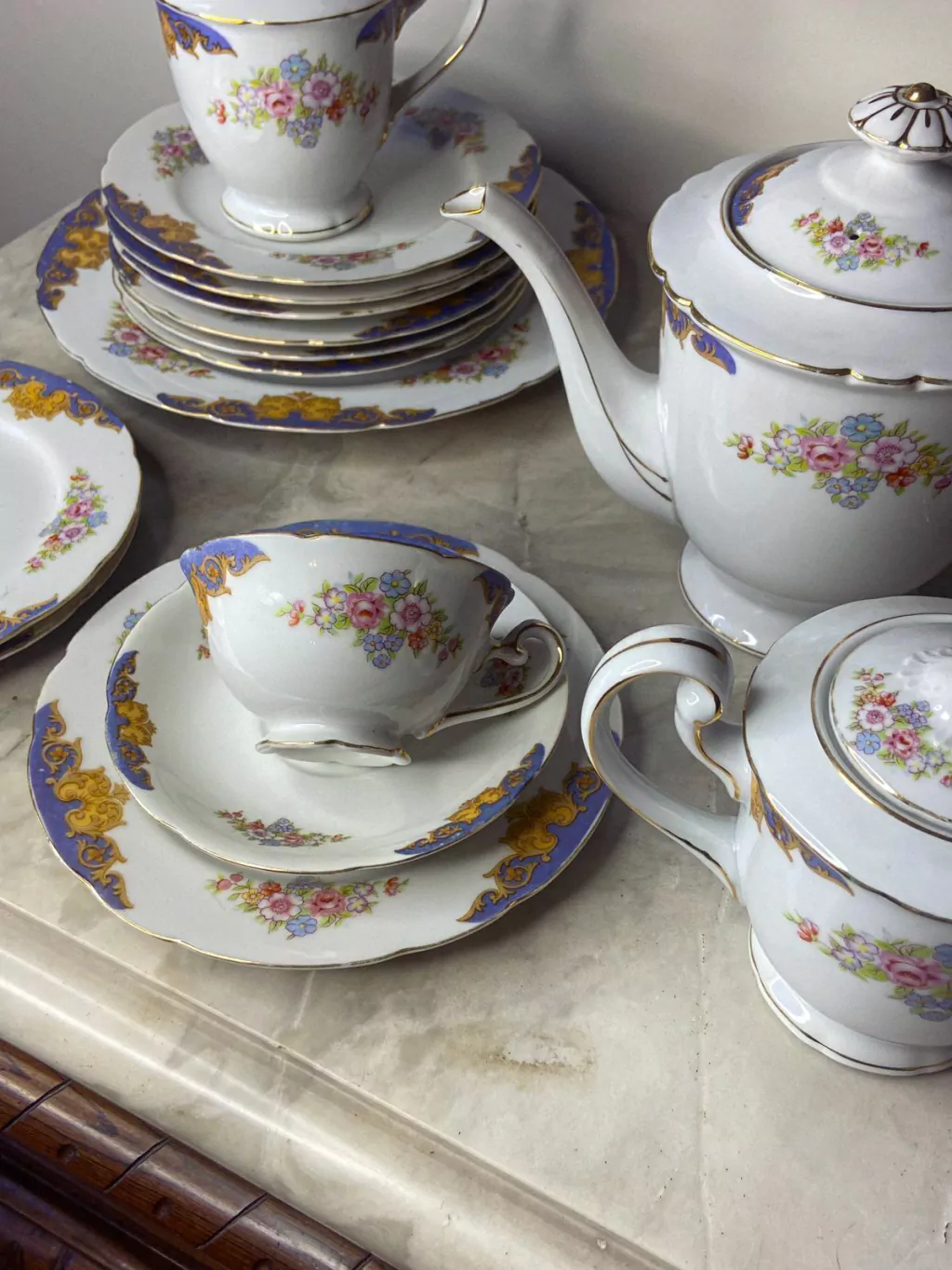 Com bule, açucareiro, leiteira, 6 xícaras de chá com pires e 6 pratos de sobremesa