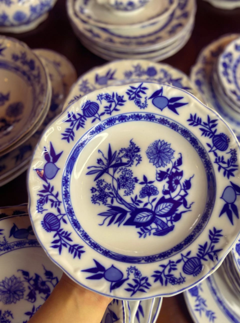 Conjunto com 4 pratos fundos em porcelana vintage no padrão cebolinha.