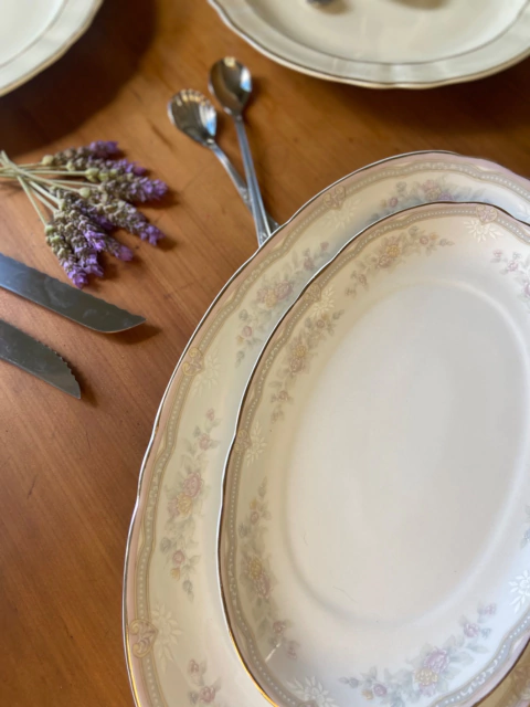 Duo de travessas com delicada decoração floral em tons pastéis e filetes dourados.