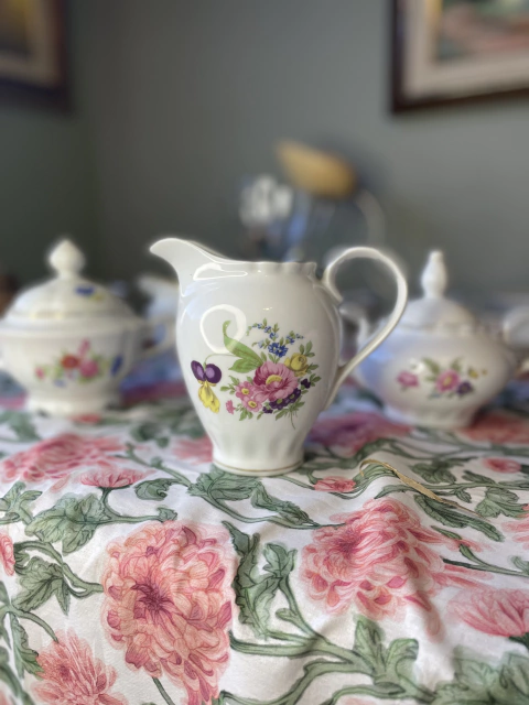 Leiteira em porcelana Steatita,apresentando decoração floral e filetes à ouro