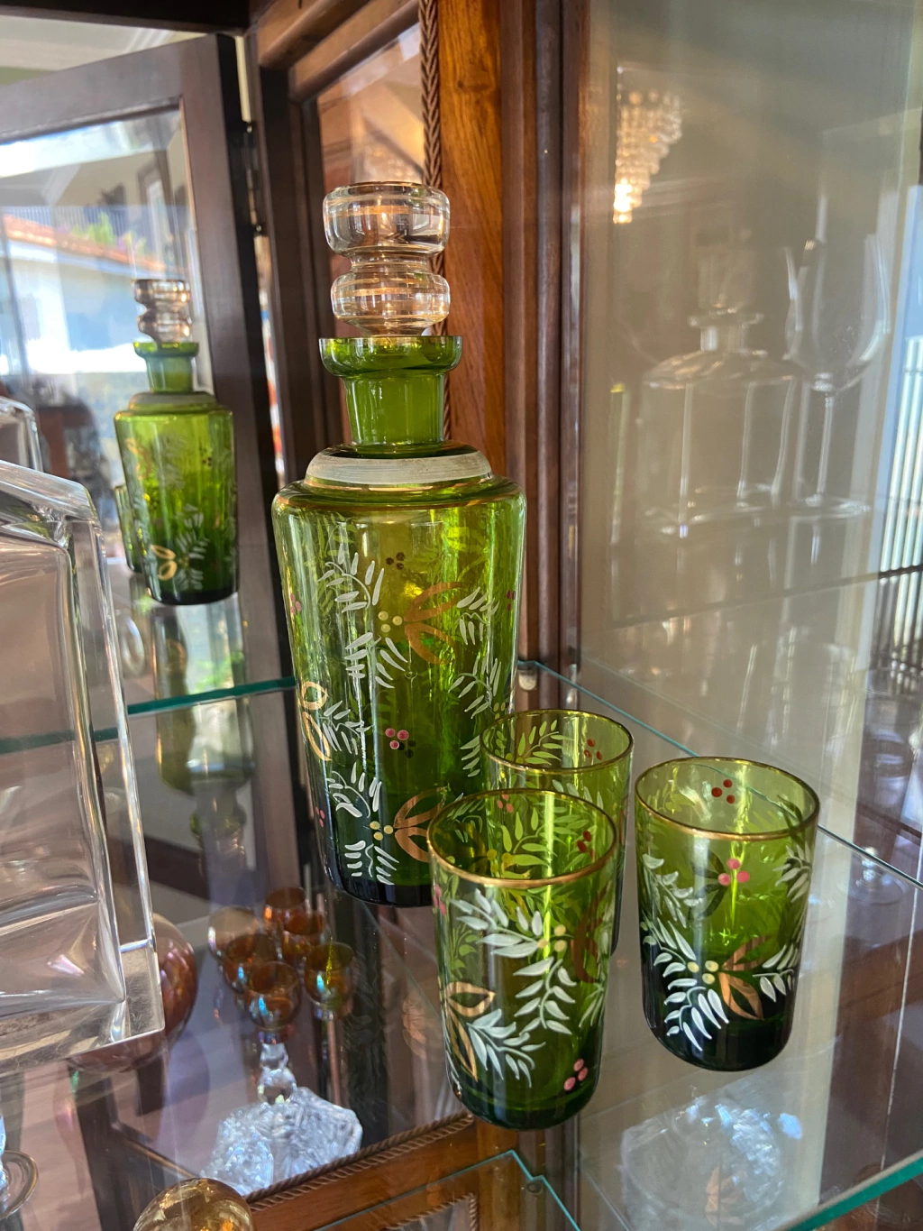 Uma linda licoreira é uma peça única, com copinhos em vidro no estilo veneziano. Essa licoreira é antiga e possui um encantador tom verde, que a torna ainda mais especial. Cada copinho é cuidadosamente trabalhado com detalhes característicos do estilo veneziano, criando um conjunto elegante e distintivo