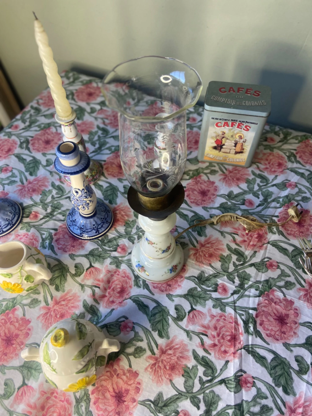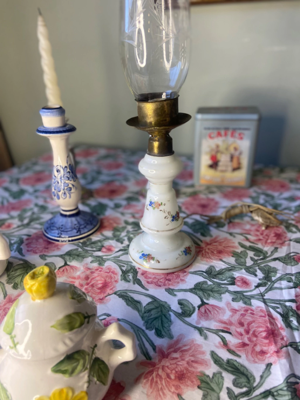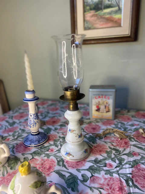 Antiga e delicada luminária com base em opalina branca,decorada com flores e folhagens policromada com guarnição em metal dourado.