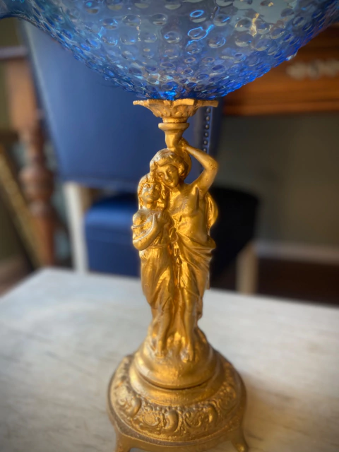 Base em ferro fundido com patina,vidro azul com bordas plissadas que trazem um lindo movimento para peça