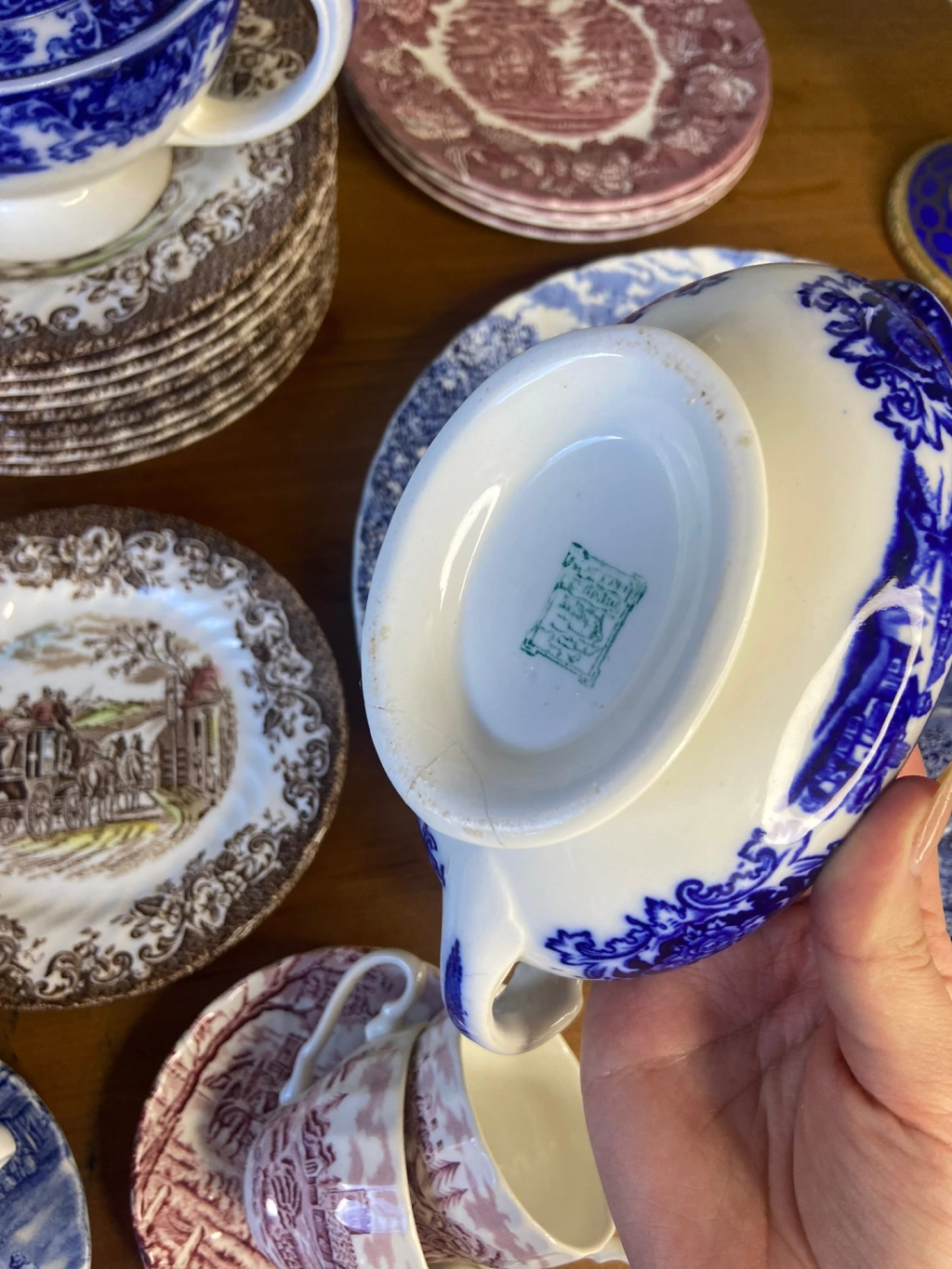 Séc XIX -(1890)- GRINDLEY ENGLAND- Rara molheira de coleção , INGLESA, em faiança " BORRÃO AZUL" ricamente adornada com cena de épica em reserva realçada por folhagens,flores, arabescos e perolados. Med 9 cm de alt x 18 cm de larg