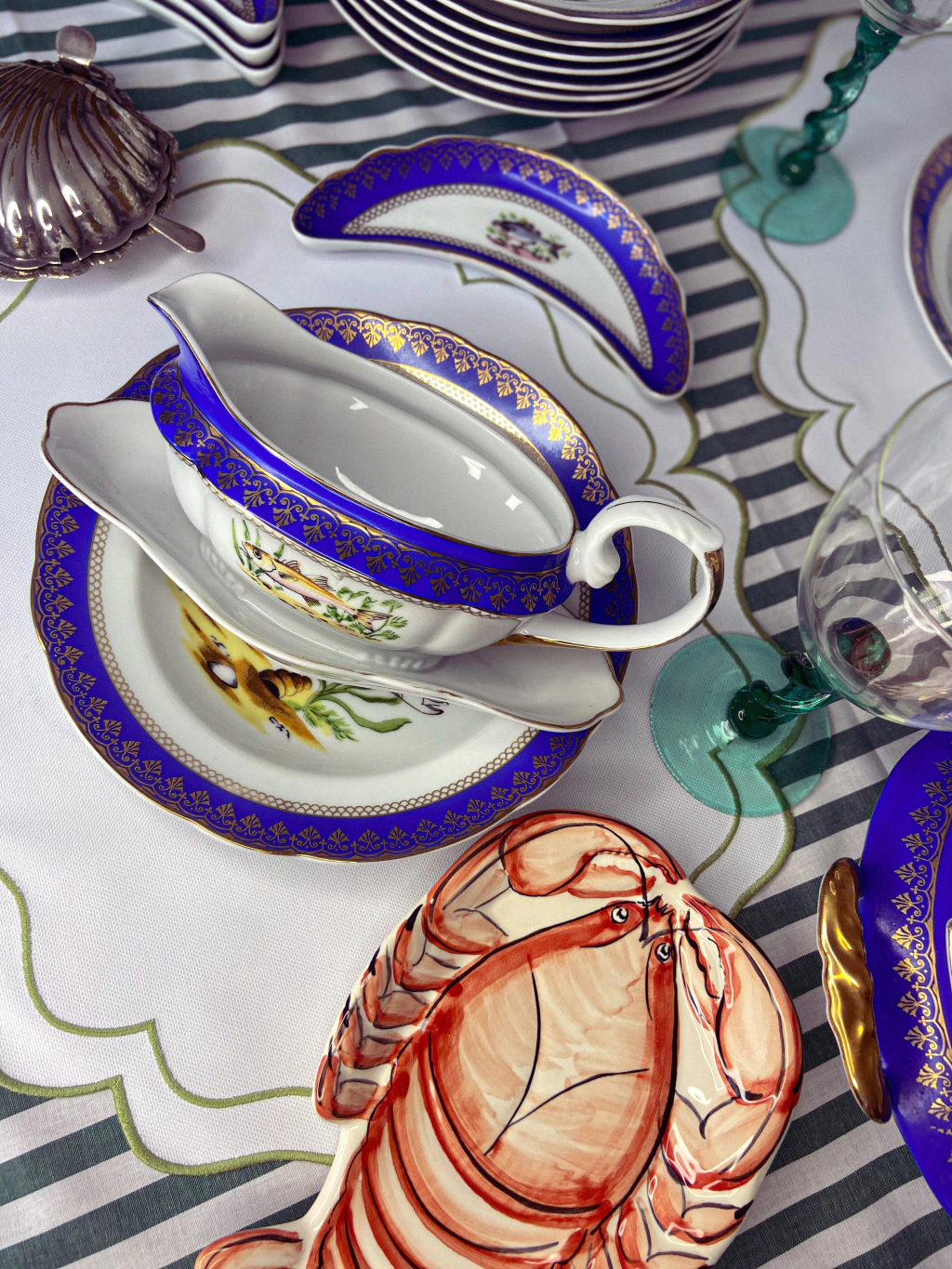 Uma exuberante molheira e seu presentoir em porcelana cativa admiradores com sua elegância. Os detalhes em azul cobalto conferem-lhe uma sofisticação atemporal, enquanto a delicada decoração de peixe adiciona um toque de serenidade inspirada na natureza. Uma peça que não só encanta visualmente, mas também conta uma história com sua beleza intrínseca.