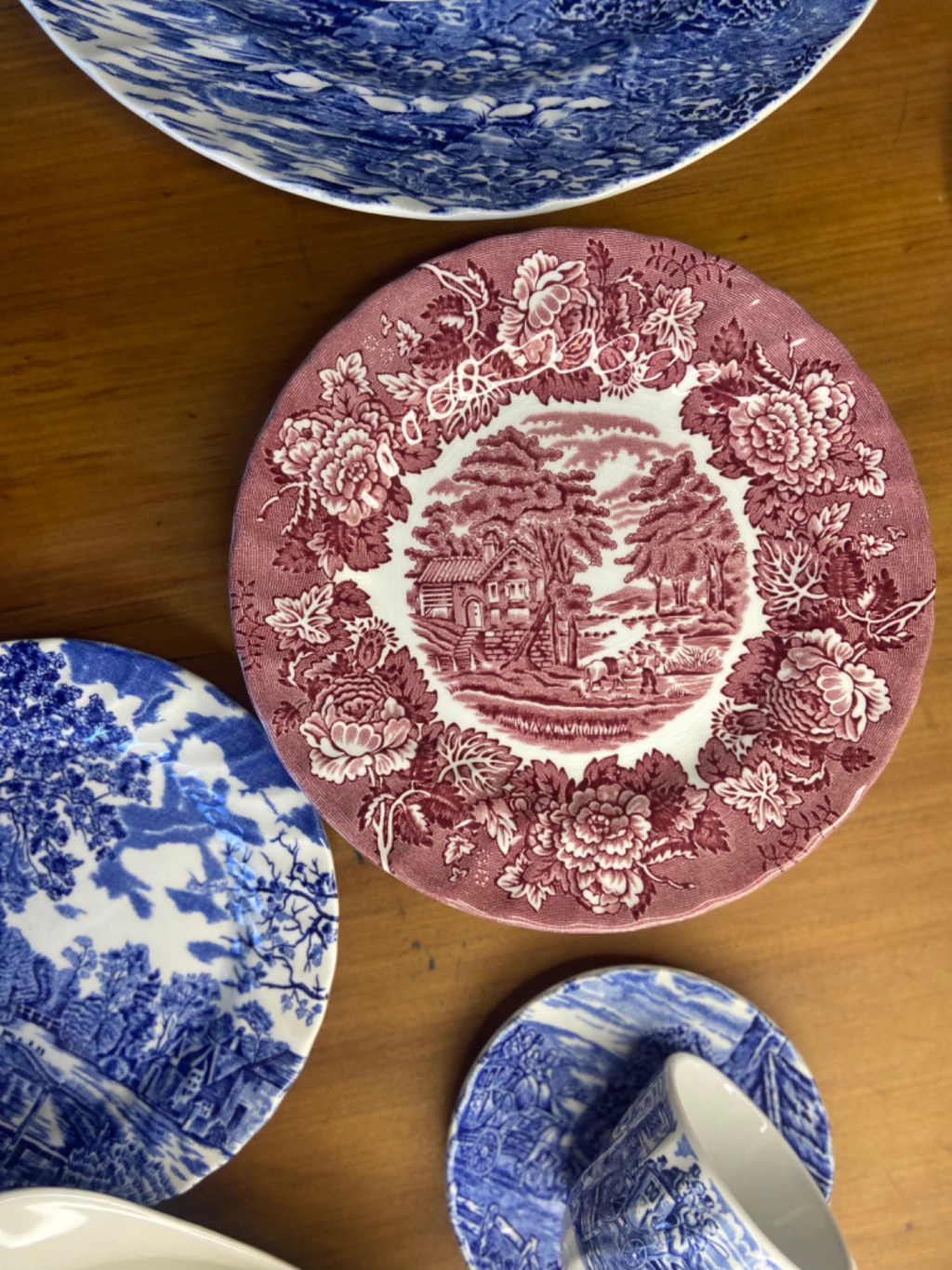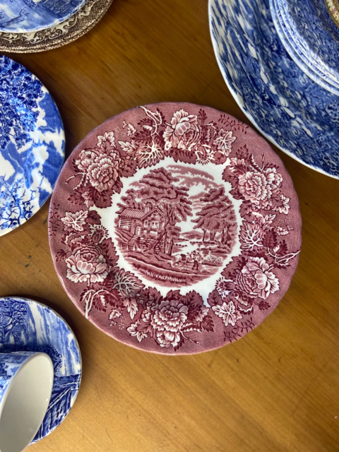 Prato em faiança inglesa,decoração de fazenda no campo central,bordas com decoração floral