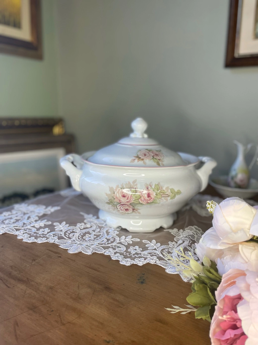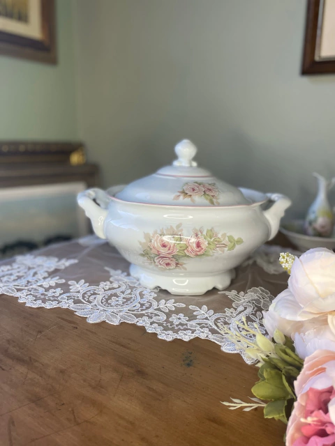 Apresentando delicada decoração de rosas adornado com delicados filetes na cor rosa
