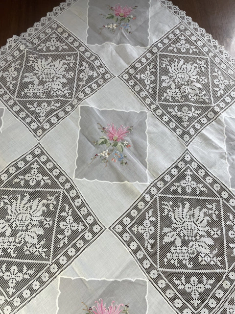 Belíssima toalha de mesa em Richilieu Ilha da Madeira, ricamente decorada com flores coloridas bordadas